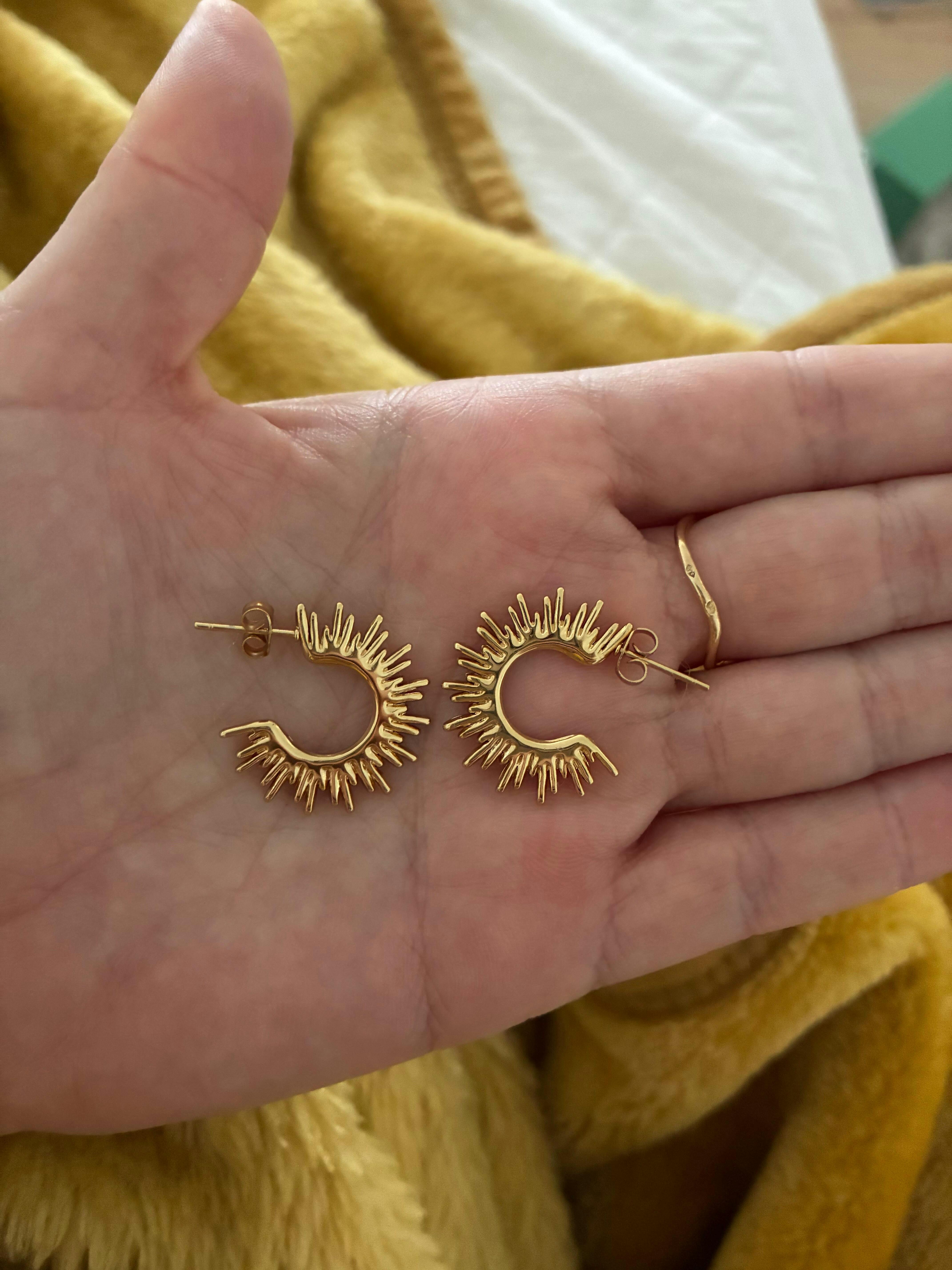 These earrings are for those who aren't afraid to stand out. The sunburst design symbolises energy, vitality, and radiance—perfect for making a confident statement. Whether you're heading to a concert, a night out, or just want to elevate your everyday look, these hoops deliver maximum impact. The waterproof and hypoallergenic materials means you can wear them confidently every day without irritation, and the long-lasting, tarnish-free plating ensures your earrings will maintain their brilliant shine for years to come.